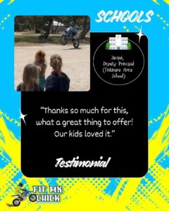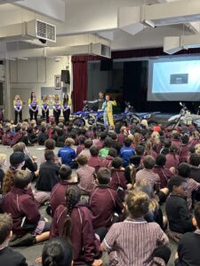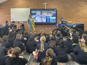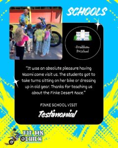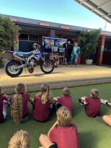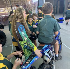 As a female competitor in events such as the Finke Desert Race, Naomi understands how powerful representation can be. Very few young people grow up seeing women race motorcycles, and her visits help broaden perspectives about what is possible. She has a strong desire to give back and create opportunities for other women and girls to access the sport — and to show all students that courage, resilience, and determination matter more than background or gender.
